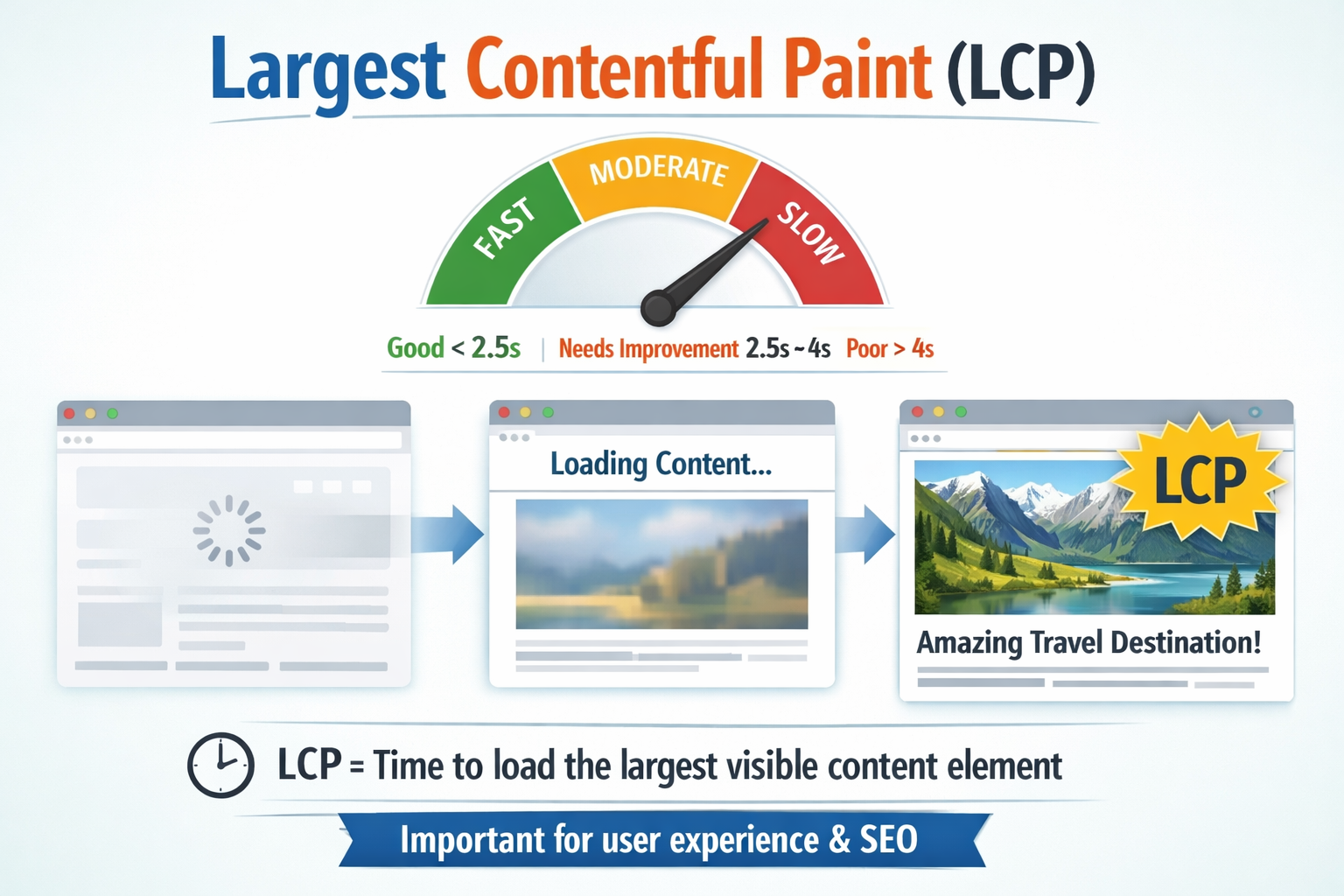 A faster LCP creates a sense of instant responsiveness. Users perceive the website as fully operational even though the remaining content continues to load. A slow LCP, on the other hand, creates frustration and increases bounce rates.